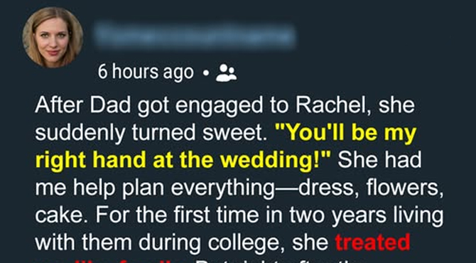 Do you know that feeling when someone is acting “too” nice? Like they’re overcompensating for something? That was Rachel, my stepmother. And I’m still crushed by what she did on the day she married my dad.