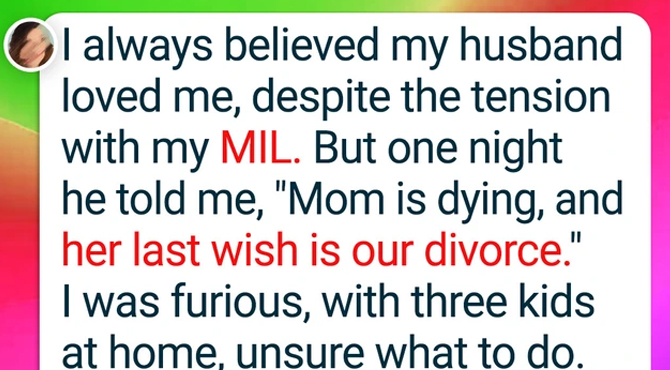I always believed my husband loved me, even with all the tension with my MIL. We have three kids together, aged 7, 5, and 2, and I thought our family was solid. But one evening, out of nowhere, he told me, “My mom is dying, and I have to honor her last wish. I’m divorcing you.” I couldn’t believe it.