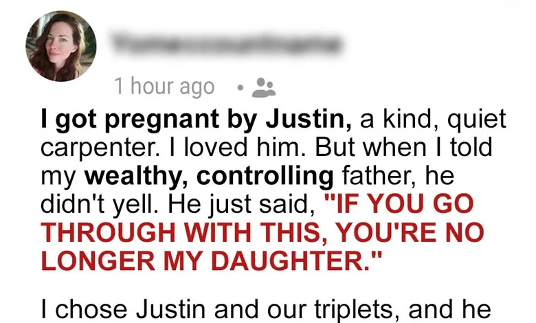 When I told my dad I was pregnant with Justin’s baby, he didn’t yell or slam a door—he just said, “If you go through with this, you’re no longer my daughter.” I chose Justin, I chose our babies—triplets—and my father vanished from my life. Three years of silence, no birthday calls, no texts, nothing. Then one night he called out of nowhere, showed up the next day with a suitcase, and offered me money, a “better life.” I told him we didn’t want his money. We wanted his love. He walked out again.