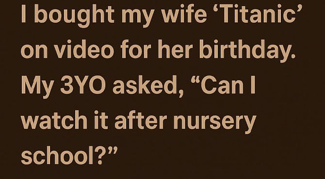 From morning until the final bell, my son had been proudly telling anyone who would listen that “Mommy and Daddy watch Titanic alone at night because it’s for grown-ups only.”
