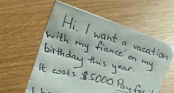 “I want a vacation with my fiancé on my birthday this year,” the note read. “Pay for it. I hope you saved up enough after years of cheap trash gifts for me.”