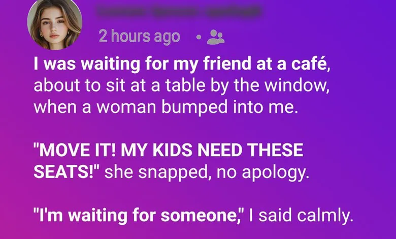 I was waiting for my friend at a cafe, about to sit at a table by the window, when a woman bumped into me. “MOVE IT! MY KIDS NEED THESE SEATS!” she snapped, no apology.”I’m waiting for someone,” I said calmly. She sneered, “I’m friends with the owner. I can have you kicked out in…